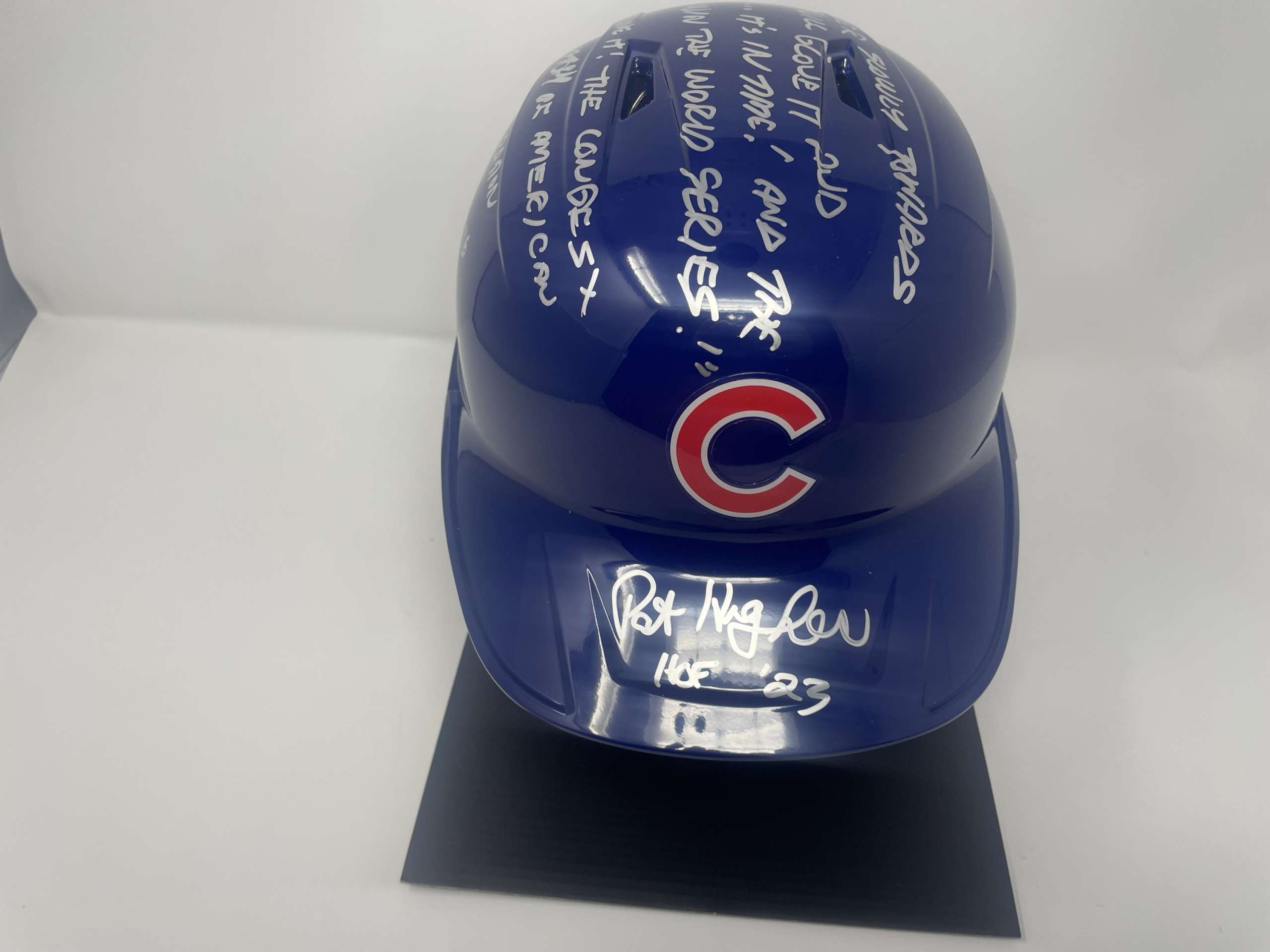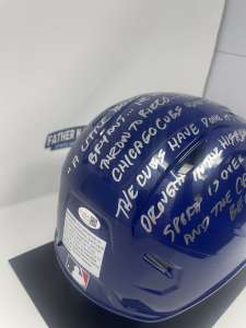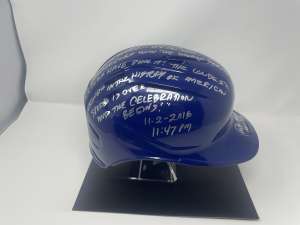 This full-size replica helmet has been personally signed by legendary Chicago broadcaster Pat Hughes and features the unforgettable “2016 World Series Final Call” inscription celebrating the Cubs’ historic championship season.